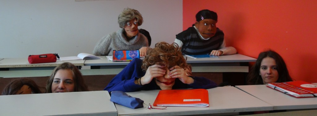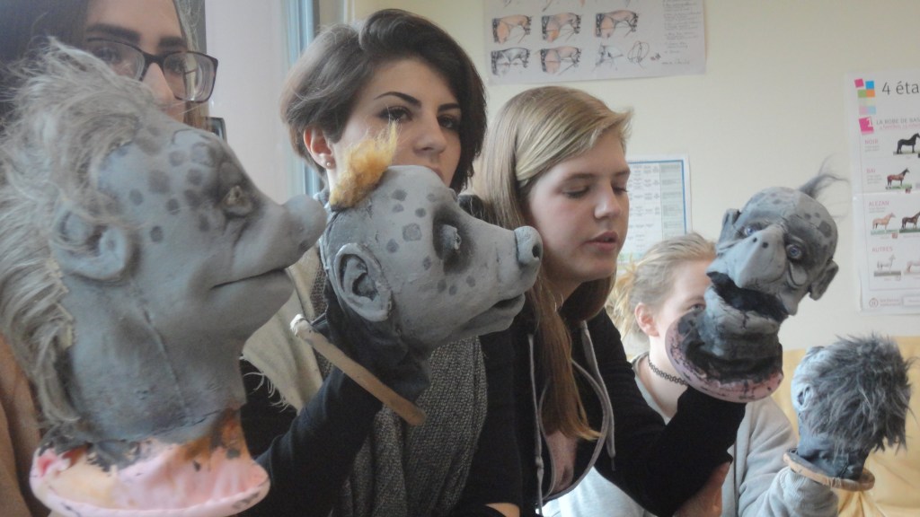 La compagnie installe avec les étudiants un studio de tournage : écran vert pour l’incrustation en chrominance, écran en papier si travail d’ombres, lumières et scénographie.