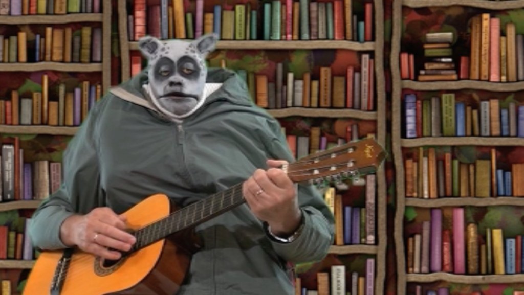 Notre histoire commence dans la bibliothèque avec 6 marionnettes en action. Les tables ont été surélevées sur des tabourets pour aider l’équipe à se cacher au mieux de la caméra. C’est un plan très difficile car chacun doit être actif tout en étant aveugle.